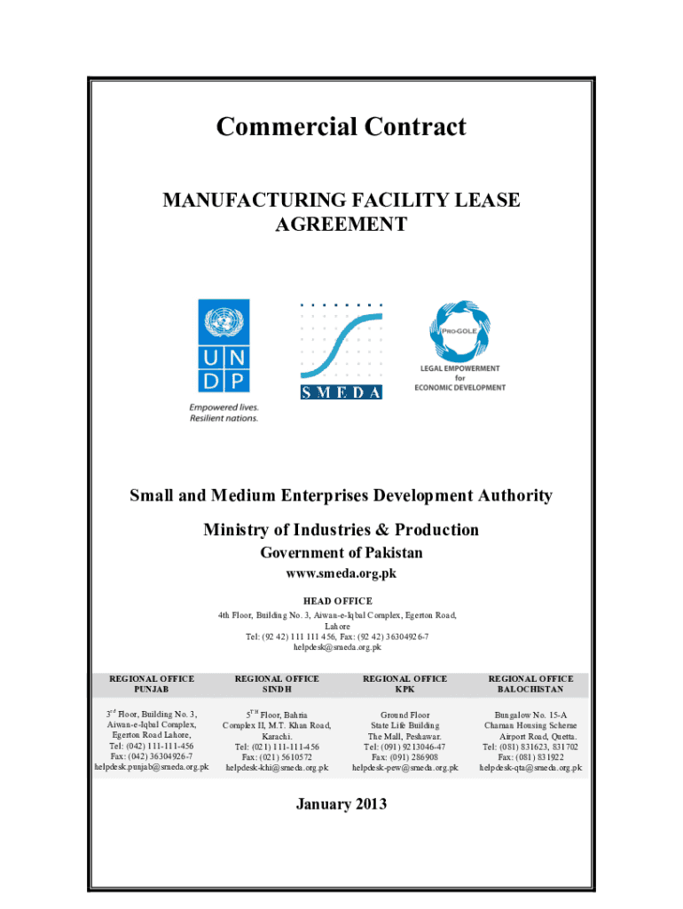 Commercial Contract MANUFACTURING FACILITY LEASE AGREEMENT Small and Medium Enterprises Development Authority Ministry of Industries & Production Government of Pakistan www.smeda.org.pk HEAD OFFICE
