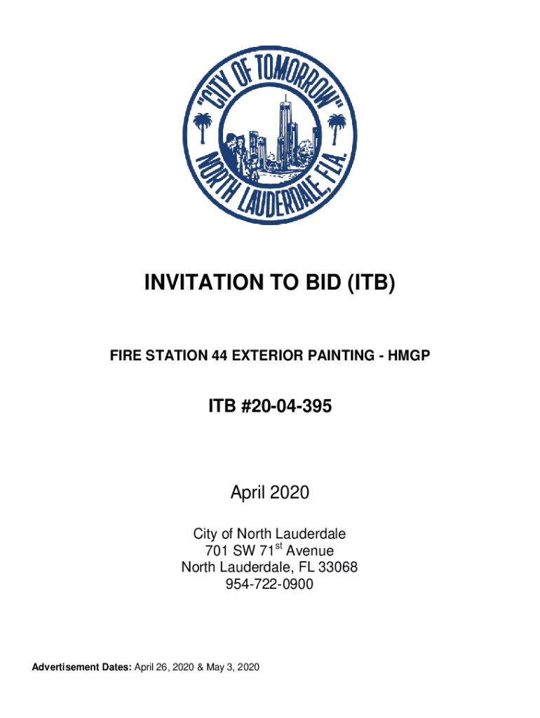 INVITATION TO BID (ITB)FIRE STATION 44 EXTERIOR PAINTING HMGPITB #2004395April 2020 City of North Lauderdale 701 SW 71st Avenue North Lauderdale, FL 33068 9547220900Advertisement Dates: April 26,