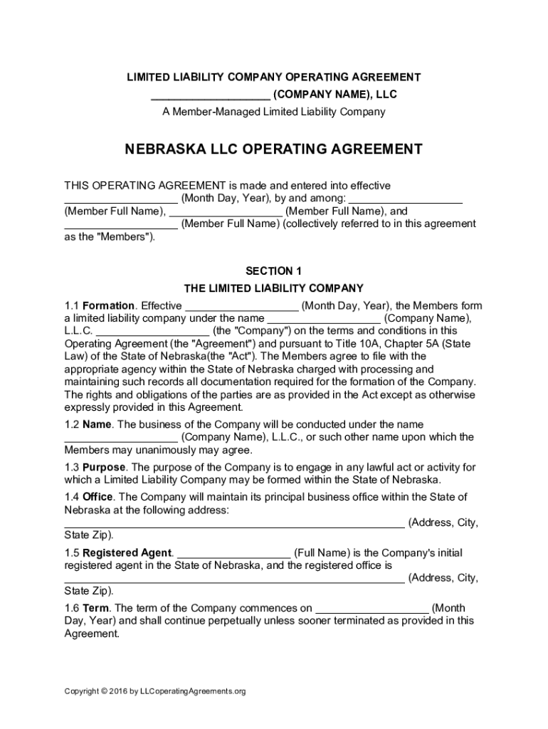 LIMITED LIABILITY COMPANY OPERATING AGREEMENT ___ (COMPANY NAME), LLC A MemberManaged Limited Liability CompanyNEBRASKA LLC OPERATING AGREEMENT THIS OPERATING AGREEMENT is made and entered into effective