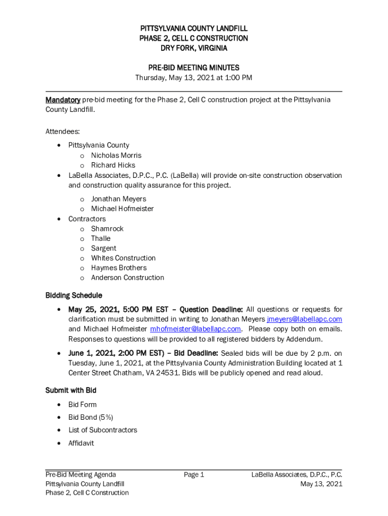 PENNSYLVANIA COUNTY LANDFILL PHASE 2, CELL C CONSTRUCTION DRY FORK, VIRGINIA PREBID MEETING MINUTES Thursday, May 13, 2021, at 1:00 PM Mandatory prebid meeting for the Phase 2, Cell C construction