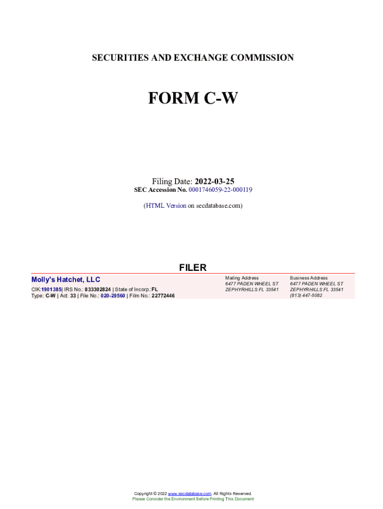 SECURITIES AND EXCHANGE COMMISSIONER Ceiling Date: 20220325SEC Accession No. 000174605922000119 (HTML Version on secdatabase.com)FILER Molly\'s Hatchet, LLC CIK:1901385| IRS No.: 833302824 | State