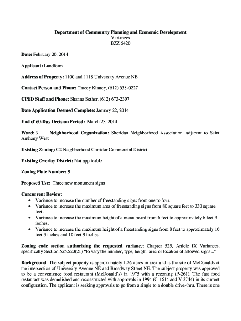 Department of Community Planning and Economic Development Variances BZZ 6420 Date: February 20, 2014, Applicant: Landform Address of Property: 1100 and 1118 University Avenue NE Contact Person and