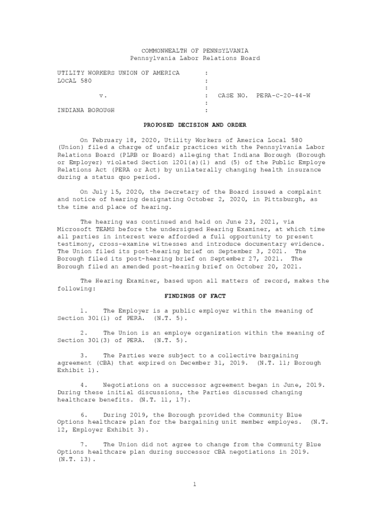 COMMONWEALTH OF PENNSYLVANIA Labor Relations Board UTILITY WORKERS UNION OF AMERICA LOCAL 580: : : : : :v. INDIANA BOROUGH CASE NO.PERAC2044WPROPOSED DECISION AND ORDER On February 18, 2020, Utility