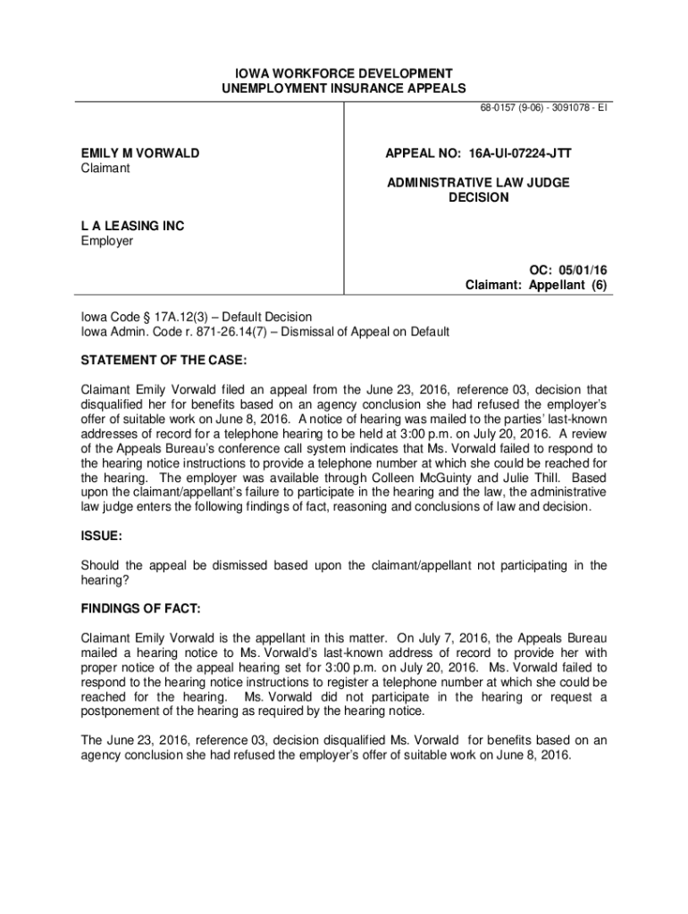 IOWA WORKFORCE DEVELOPMENT UNEMPLOYMENT INSURANCE APPEALS 680157 (906) 3091078 EMILY M FORWARD ClaimantAPPEAL NO: 16AUI07224JTT ADMINISTRATIVE LAW JUDGE DECISION A LEASING INC Employer OC: 05/01/16
