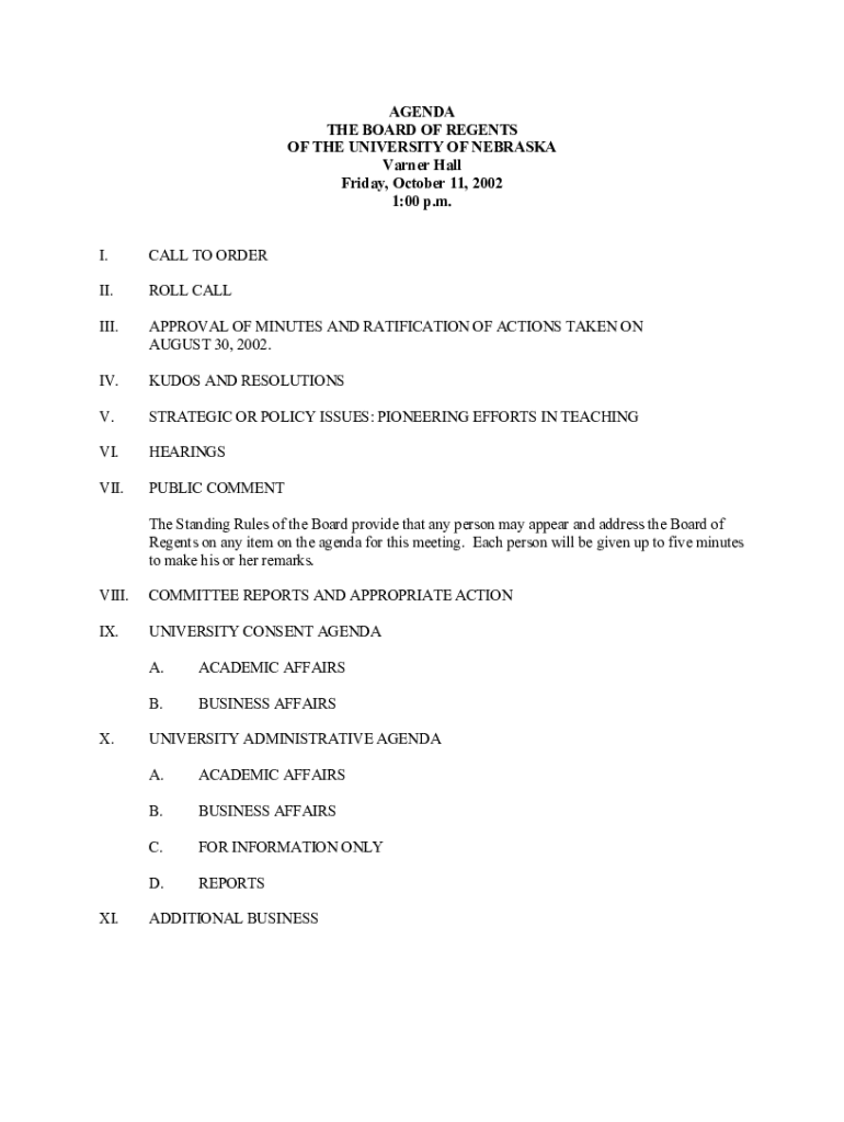 AGENDA THE BOARD OF REGENTS OF THE UNIVERSITY OF NEBRASKA Warner Hall Friday, October 11, 2002 1:00 p.m. I.CALL TO ORDER.ROLL CALLING.APPROVAL OF MINUTES AND RATIFICATION OF ACTIONS TAKEN ON AUGUST