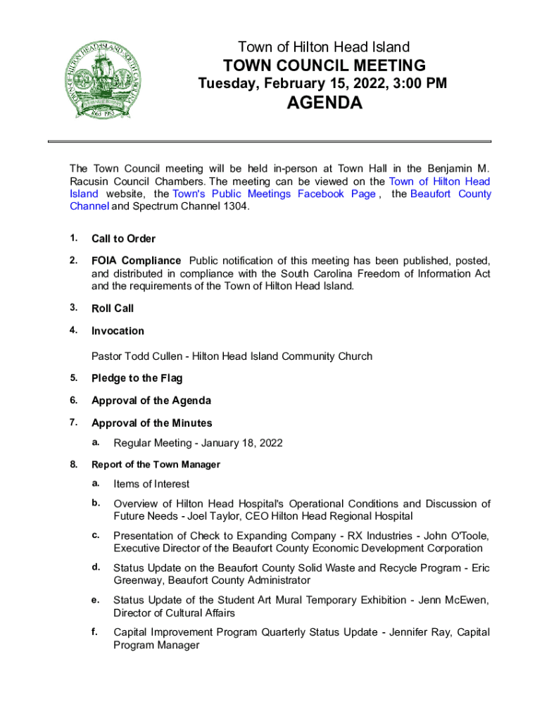 Town of Hilton Head IslandTOWN COUNCIL MEETING Tuesday, February 15, 2022, 3:00 PMAGENDAThe Town Council meeting will be held unperson at Town Hall in the Benjamin M. Raisin Council Chambers. The