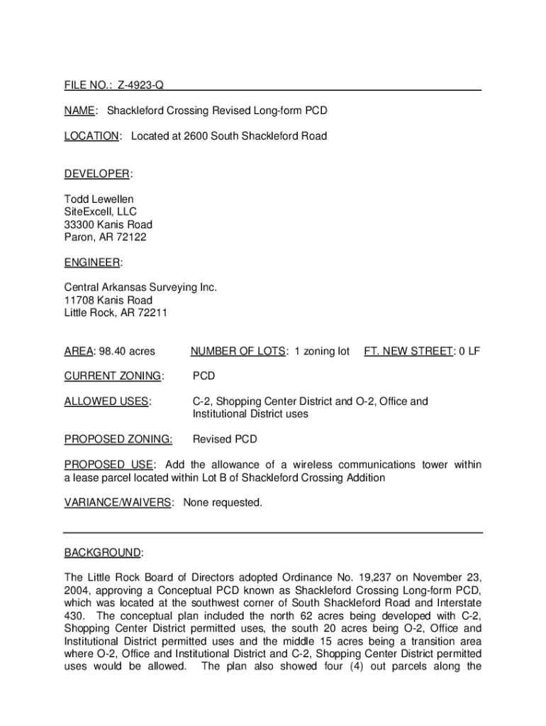 FILE NO.: Z4923Q NAME: Shackle ford Crossing Revised Long form PCD LOCATION: Located at 2600 South Shackle ford Co-developer: Todd Llewellyn SiteExcell, LLC 33300 Keynes Road Patron, AR 72122 ENGINEER: