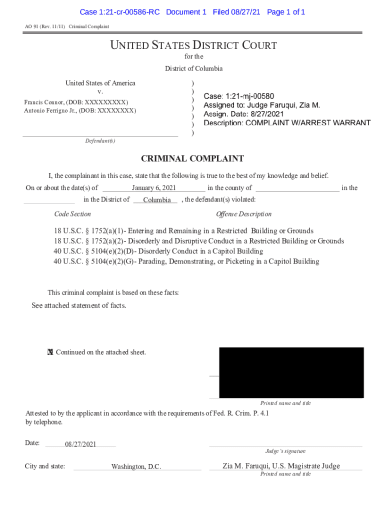 Case 1:21cr00586RC Document 1 Filed 08/27/21-Page 1 of 1 AO 91 (Rev. 11/11) Criminal ComplaintUNITED STATES DISTRICT COURT for the District of DROPPED United States of America v.) ))))))Francis Connor,