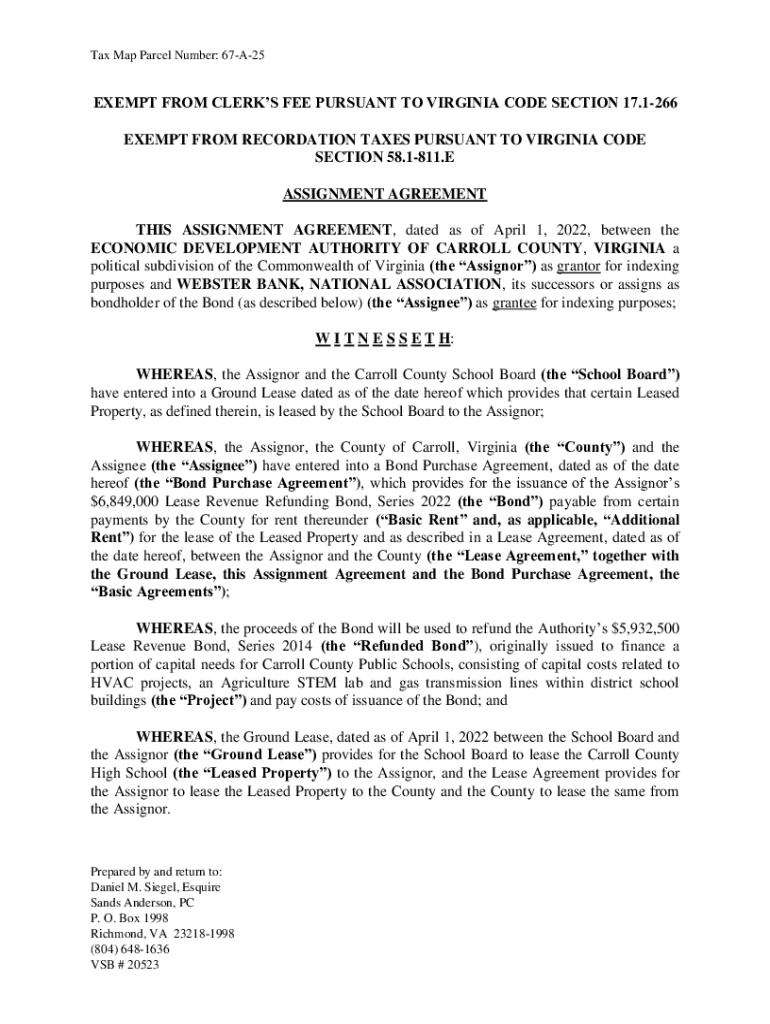 Tax Map Parcel Number: 67A25EXEMPT FROM CLERKS FEE PURSUANT TO VIRGINIA CODE SECTION 17.1266 EXEMPT FROM DECORATION TAXES PURSUANT TO VIRGINIA CODE SECTION 58.1811. E ASSIGNMENT AGREEMENT THIS ASSIGNMENT