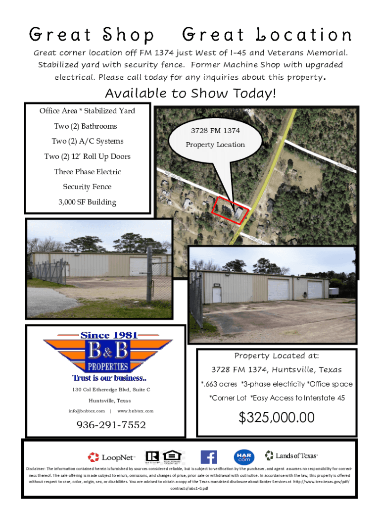 Great corner location off FM 1374 just West of I45 and Veterans Memorial. Stabilized yard with security fence. Former Machine Shop with upgraded electrical. Please call today for any inquiries about