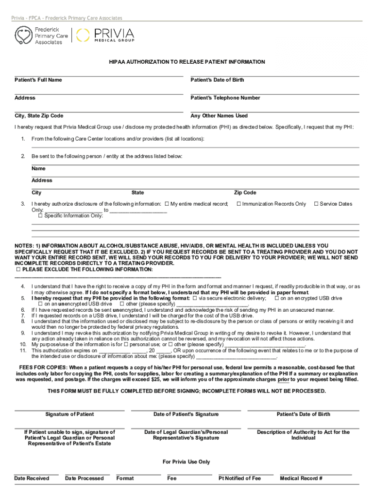 Trivia FCA Frederick Primary Care AssociatesHIPAA AUTHORIZATION TO RELEASE PATIENT INFORMATION Patient\'s Full Impatient\'s Date of BirthAddressPatient\'s Telephone Numbering, State Zip Company Other