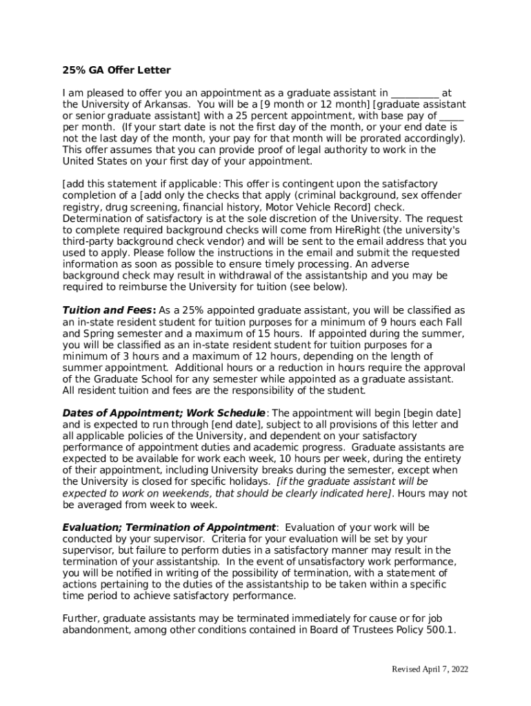 What is General Offer LetterGraduate Assistant Single Semester Appointment - graduate-and-international uark Form?