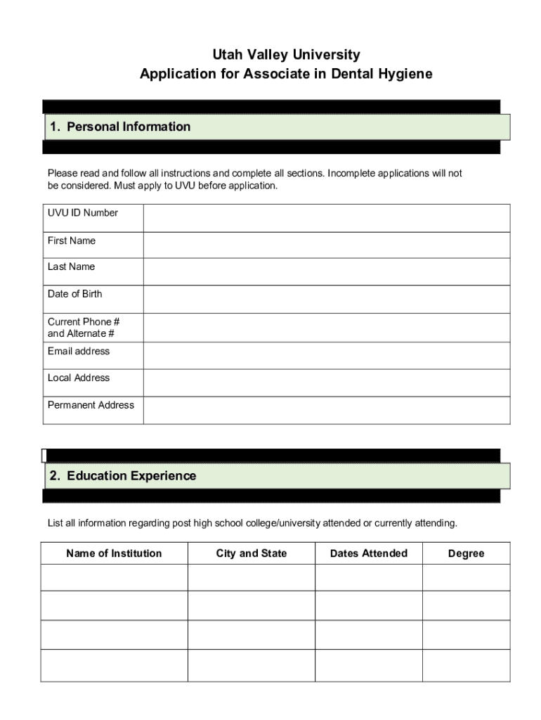 Utah Valley University Application for Associate in Dental Hygiene 1. Personal Information Please read and follow all instructions and complete all sections. Incomplete applications will not be considered.