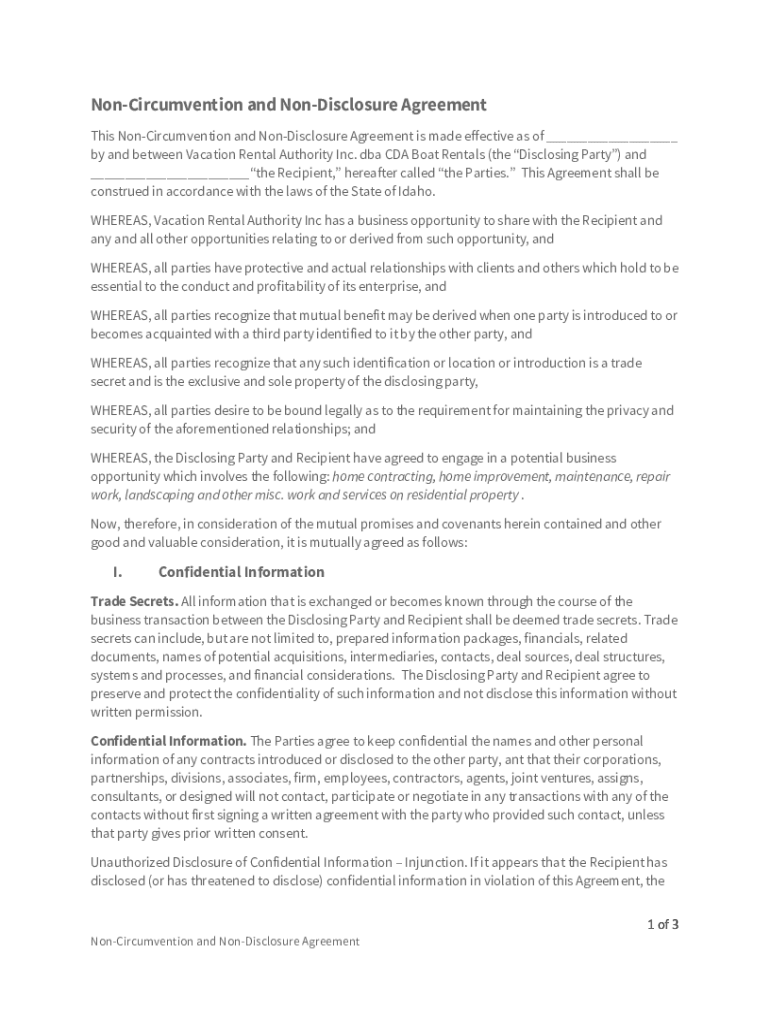 Circumvention and Nondisclosure Agreement This Circumvention and Nondisclosure Agreement is made effective as of ___ by and between Vacation Rental Authority Inc. DBA CDA Boat Rentals (the Disclosing