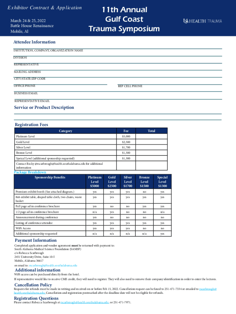 Exhibitor Contract & Application March 24 & 25, 2022 Battle House Renaissance Mobile, Al11th Annual Gulf Coast Trauma SymposiumAttendee Information INSTITUTION, COMPANY, ORGANIZATION NAME DIVISION
