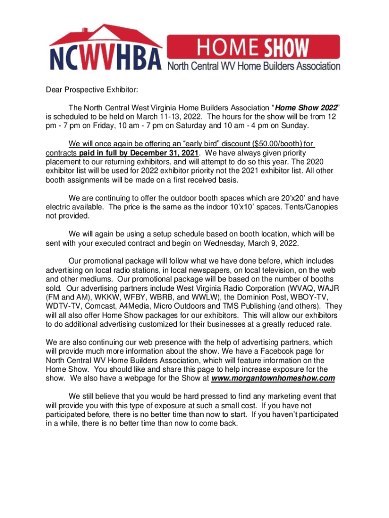 Dear Prospective Exhibitor: The North Central West Virginia Home Builders Association Home Show 2022 is scheduled to be held on March 1113, 2022. The hours for the show will be from 12 pm 7 pm on