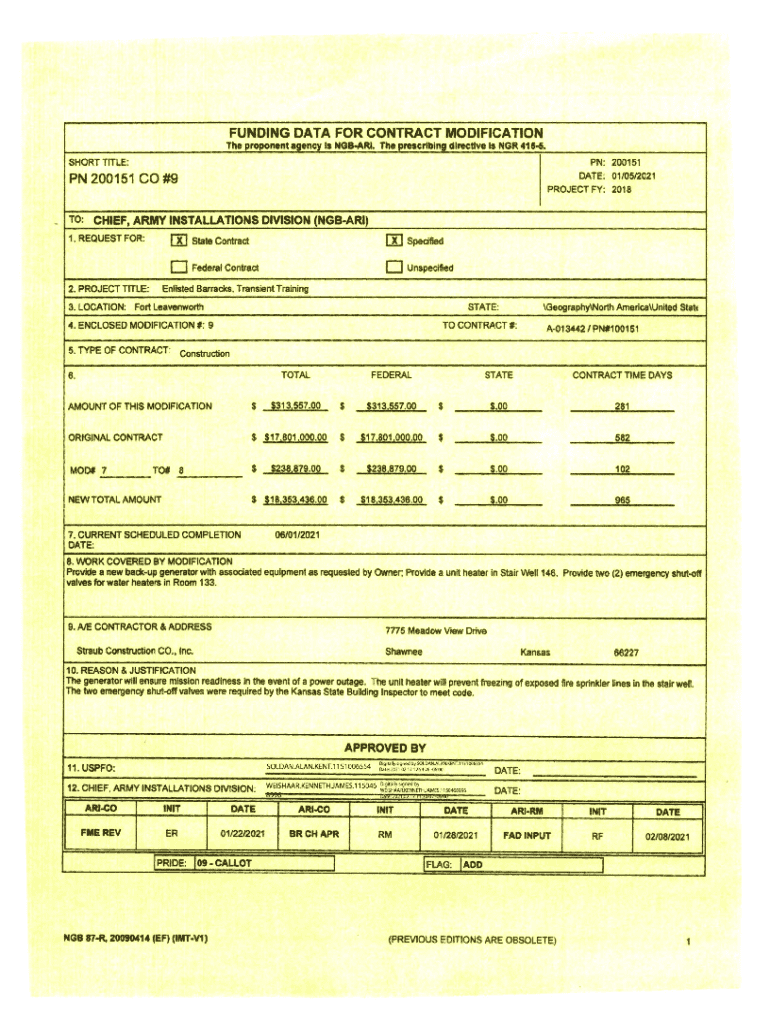 Joint Committee on State Building Construction February 25, 2021, Change Order Request (per KSA 751264) Kansas Adjutant Generals Department Ft. Leavenworth Transient Barracks, A013442 Purchase and