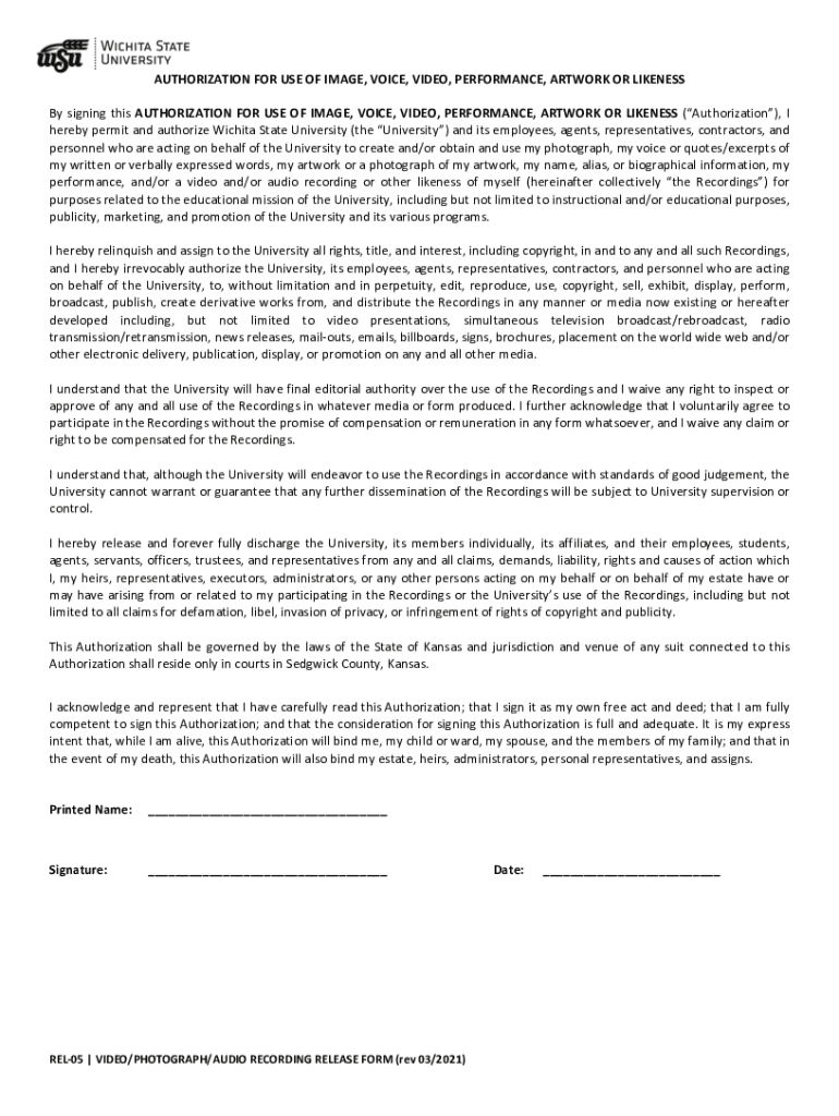 AUTHORIZATION FOR USE OF IMAGE, VOICE, VIDEO, PERFORMANCE, ARTWORK OR LIKENESS By signing this AUTHORIZATION FOR USE OF IMAGE, VOICE, VIDEO, PERFORMANCE, ARTWORK OR LIKENESS (Authorization), I hereby