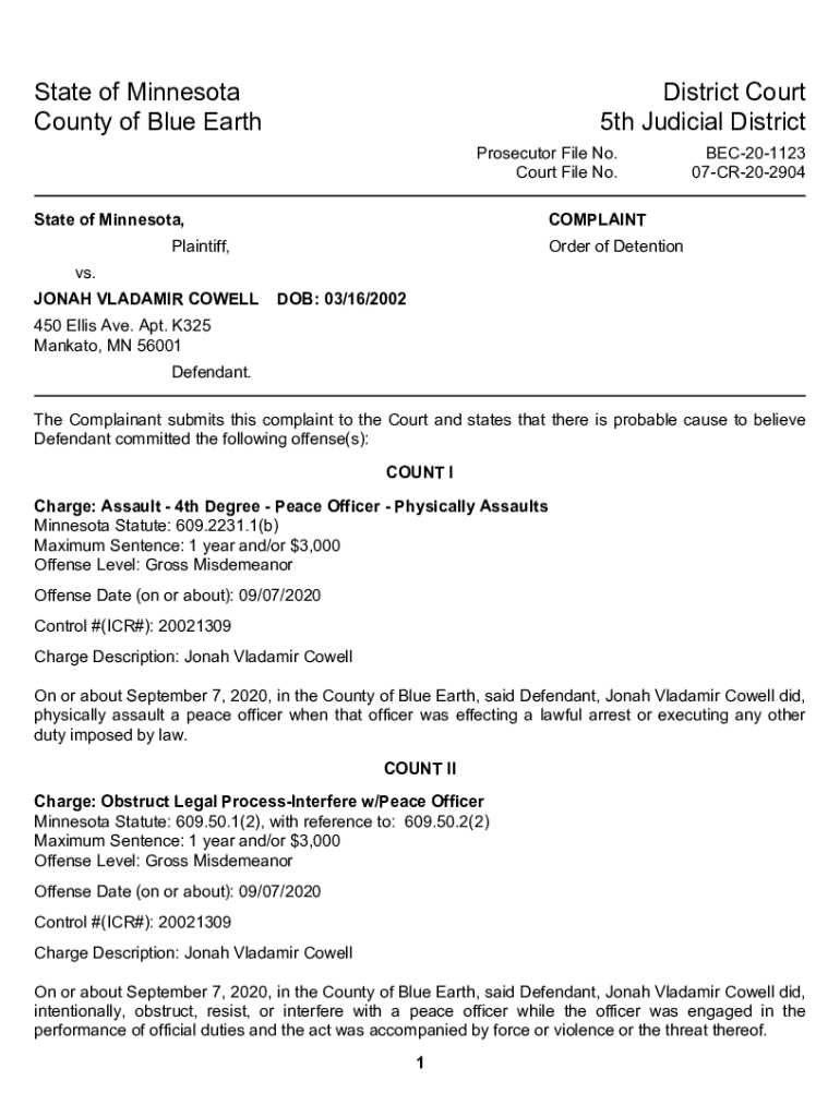 StateofMinnesota CountyofBlueEarthDistrictCourt 5thJudicialDistrict ProsecutorFileNo. CourtFileNo. StateofMinnesota,BEC201123 07CR202904COMPLAINTPlaintiff,OrderofDetentionvs. JONAHVLADAMIRCOWELLDOB:03/16/2002