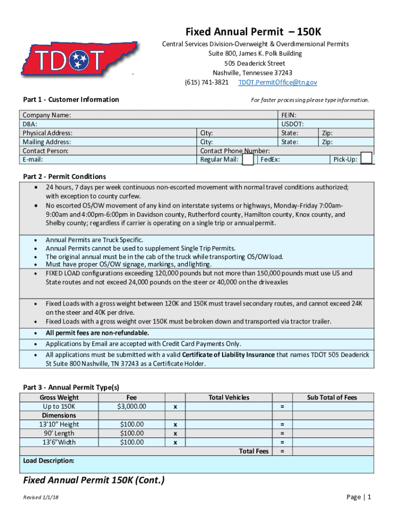 Fixed Annual Permit 150K Central Services DivisionOverweight & Over dimensional Permits Suite 800, James K. Polk Building 505 Frederick Street Nashville, Tennessee 37243 (615) 7413821 DOT. PermitOffice@tn.