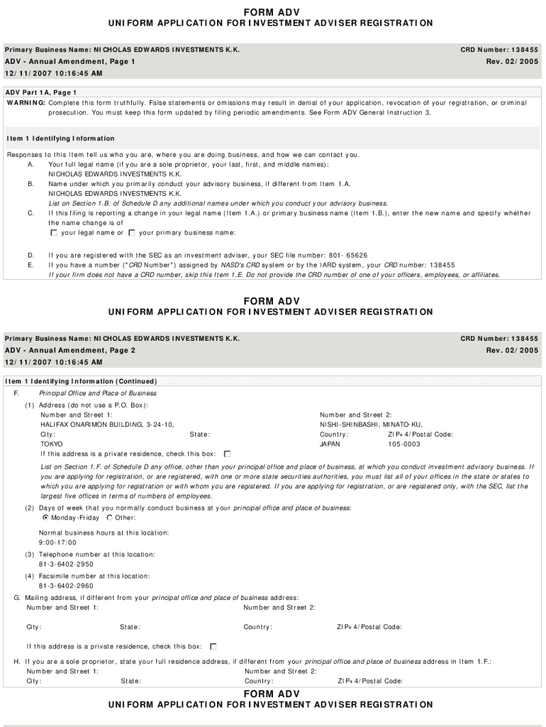 FORM ADV UNIFORM APPLICATION FOR INVESTMENT ADVISER REGISTRATION Primary Business Name: NICHOLAS EDWARDS INVESTMENTS K.K.CRD Number: 138455ADV Annual Amendment, Page 1Rev. 02/200512/11/2007 10:16:45
