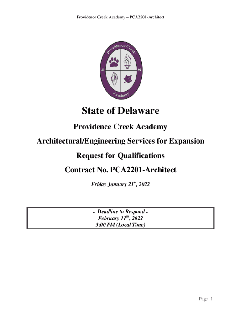 Providence Creek Academy PCA2201ArchitectState of Delaware Providence Creek Academy Architectural/Engineering Services for Expansion Request for Qualifications Contract No. PCA2201Architect Friday,