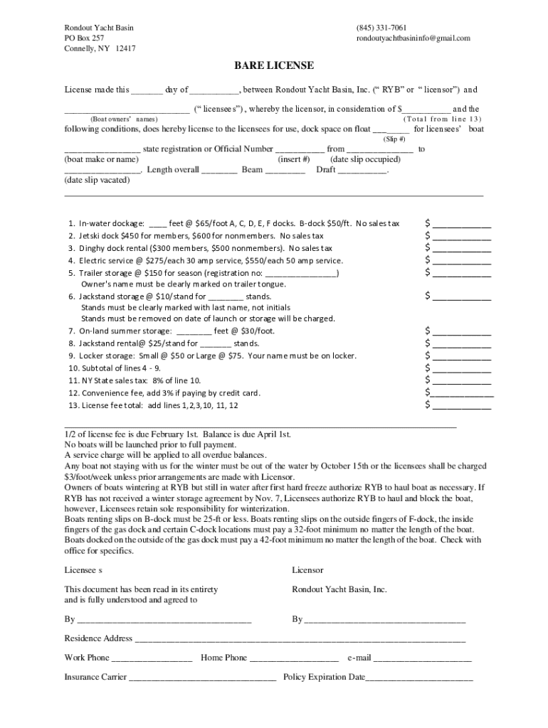 Holdout Yacht Basin PO Box 257 Connelly, NY 12417(845) 3317061 rondoutyachtbasininfo×Gmail.compare LICENSE made this ___ day of ___, between Holdout Yacht Basin, Inc. (ROB or licensor) and ___ (licensees),