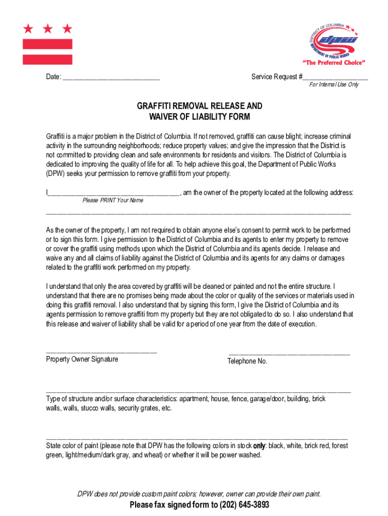 Date: ___Service Request #___ For Internal Use OnlyGRAFFITI REMOVAL RELEASE AND WAIVER OF LIABILITY FORM Graffiti is a major problem in the District of Columbia. If not removed, graffiti can cause