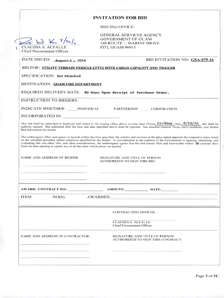INVITATION ISSUING OFFICE:(, general SERVICES AGENCY GOVERNMENT OF GUAM 148 ROUTE I, MARINE DRIVE PIT, GUAM 96915/I./...1CLAUDIA S. AFFABLE Chief Procurement Officer DATE ISSUED:BID INVITATION August