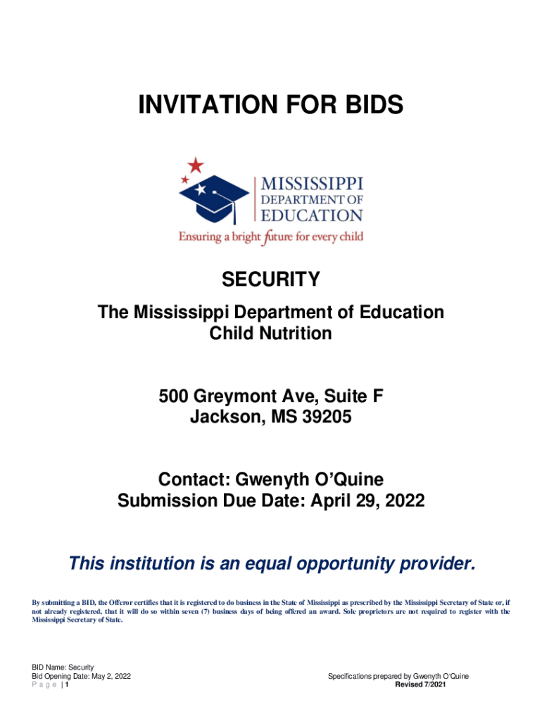 INVITATION FOR BIOSECURITY The Mississippi Department of Education Child Nutrition500 Grant Ave, Suite F Jackson, MS 39205Contact: Gwenyth Equine Submission Due Date: April 29, 2022This institution