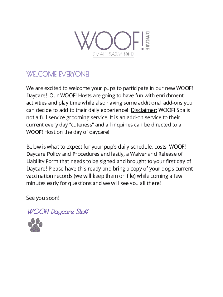 WELCOME EVERYONE! We are excited to welcome your pups to participate in our new WOOF! Daycare! Our WOOF! Hosts are going to have fun with enrichment activities and play time while also having some