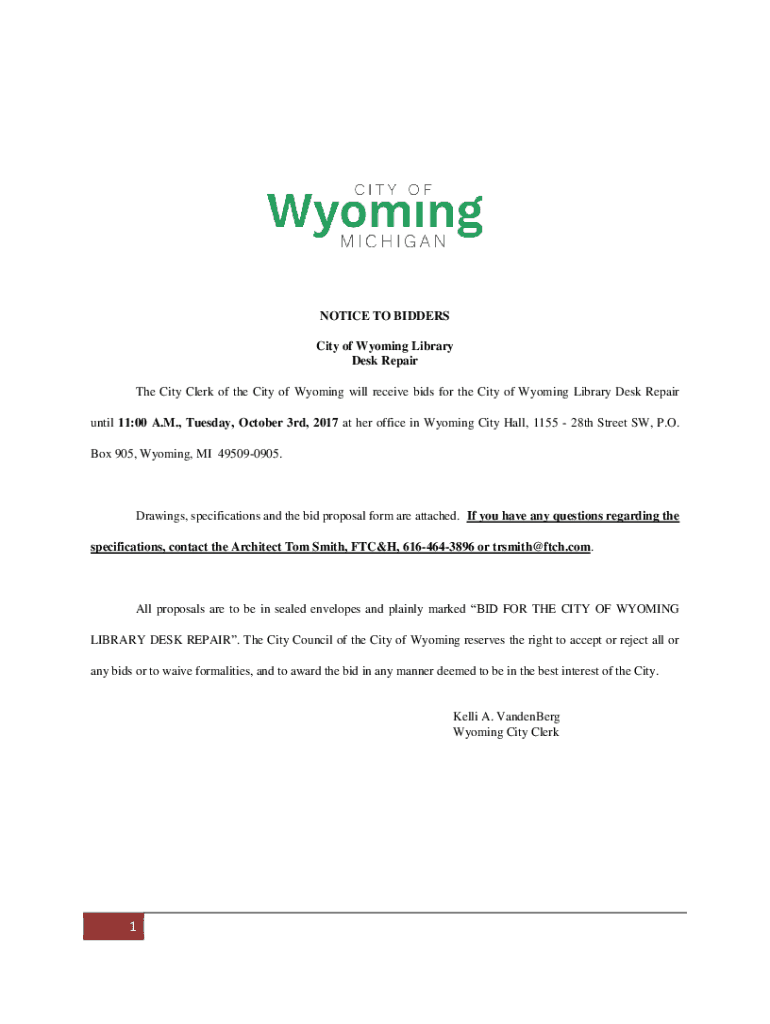NOTICE TO BIDDERS City of Wyoming Library Desk Repair The City Clerk of the City of Wyoming will receive bids for the City of Wyoming Library Desk Repair until 11:00 A.M., Tuesday, October 3rd, 2017