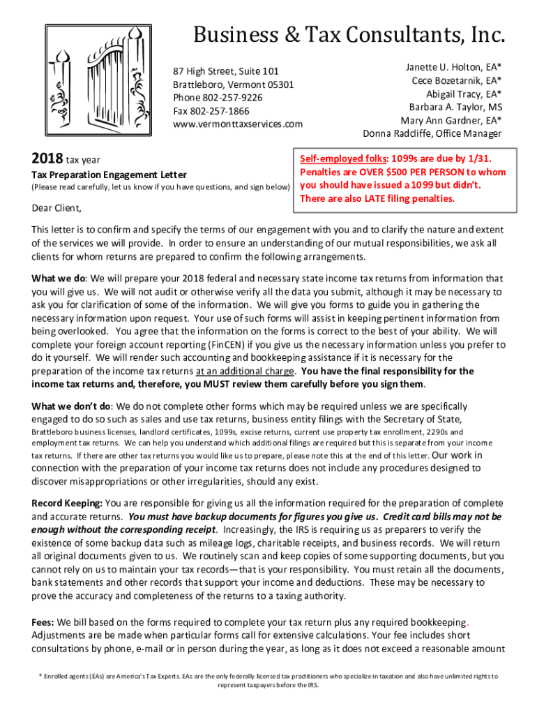 Business & Tax Consultants, Inc. 87 High Street, Suite 101 Attleboro, Vermont 05301 Phone 8022579226 Fax 8022571866 www.vermonttaxservices.comJanette U. Bolton, EA* Cede Bozetarnik, EA* Abigail Tracy,