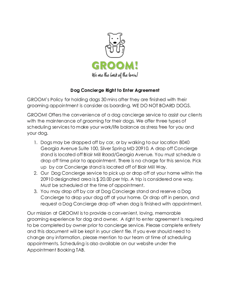Dog Concierge Right to Enter Agreement Grooms Policy for holding dogs 30 mins after they are finished with their grooming appointment is considered as boarding. WE DO NOT BOARD DOGS. GROOM! Offers
