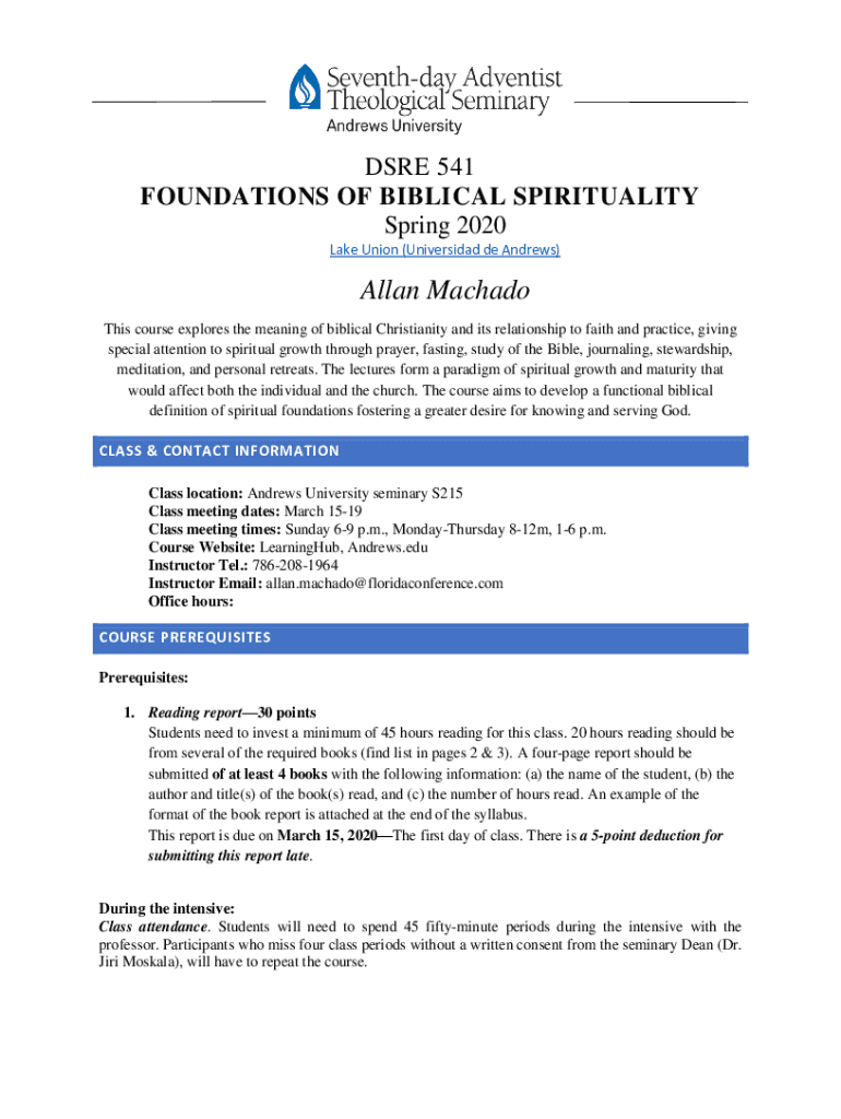 DARE 541 FOUNDATIONS OF BIBLICAL SPIRITUALITY Spring 2020 Lake Union (Universidad de Andrews)Allan Machado This course explores the meaning of biblical Christianity and its relationship to faith and