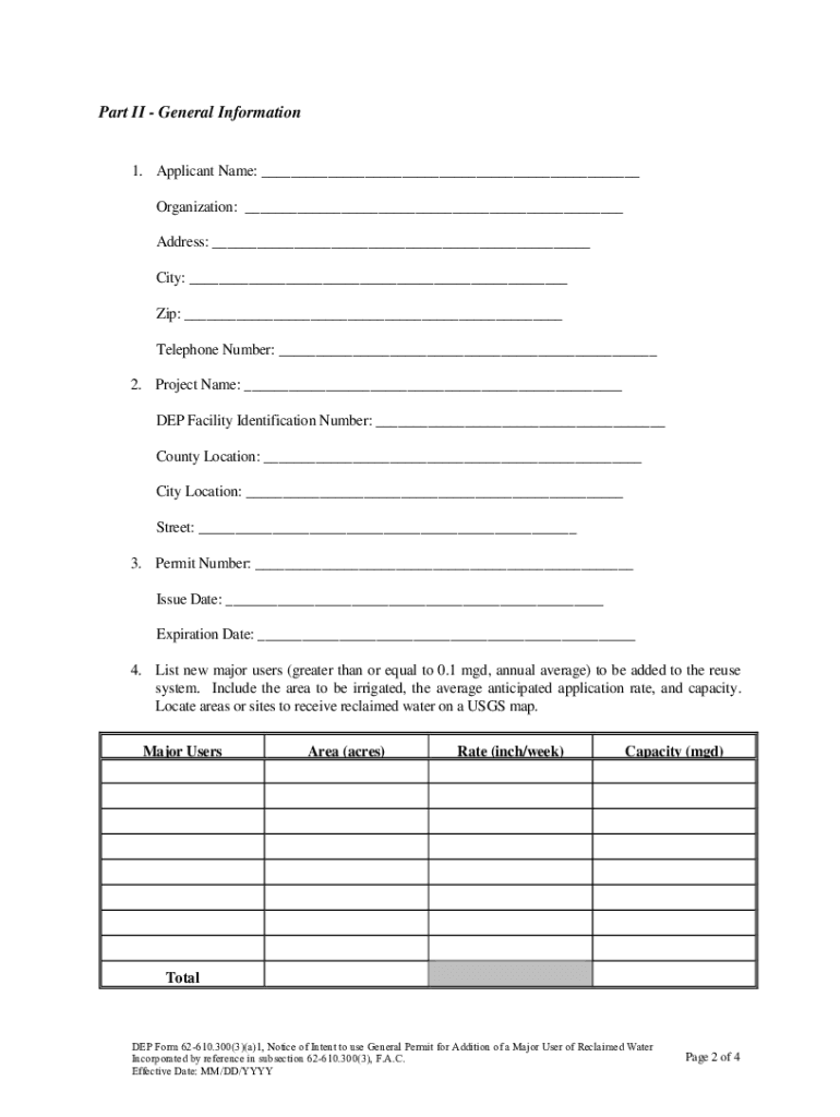 Florida Department of Environmental ProtectionNotice of Intent to use General Permits for Addition of a Major User of Reclaimed Watermark I Instructions (1) All applicable items must be completed