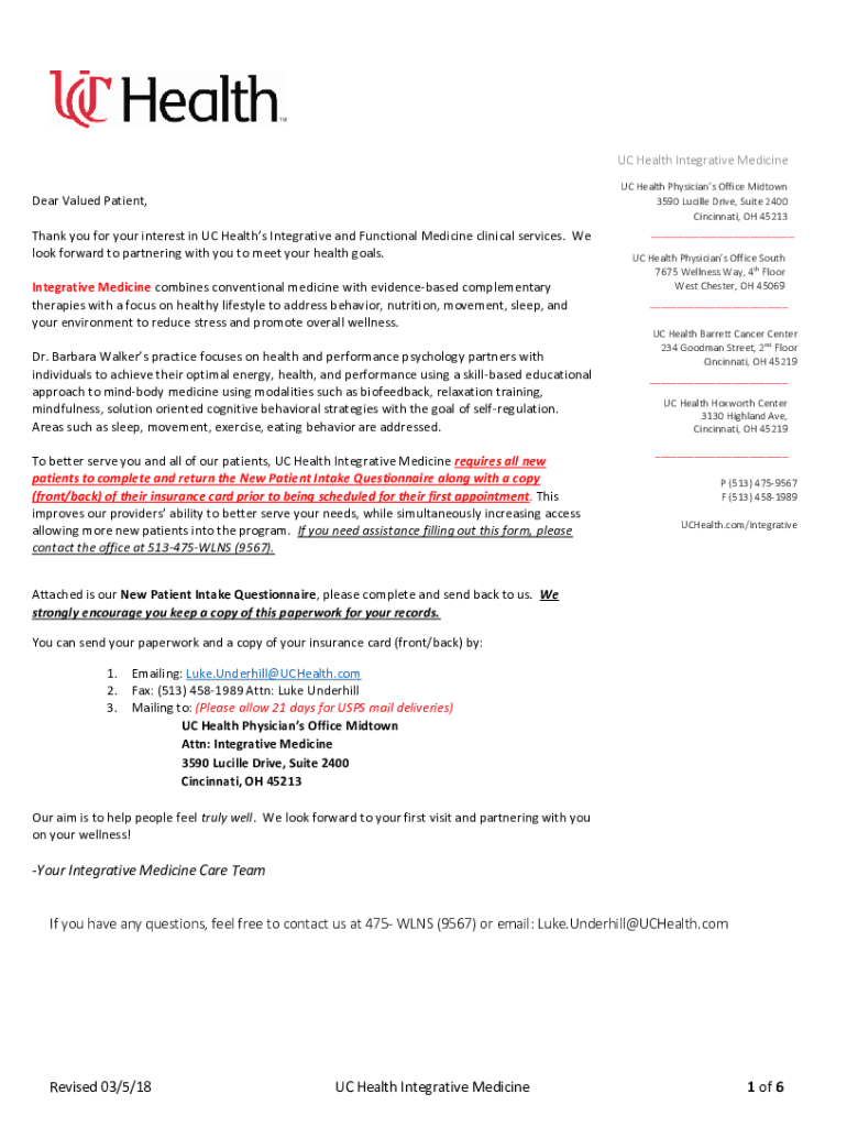 UC Health Integrative Medicine Dear Valued Patient, Thank you for your interest in UC Health Integrative and Functional Medicine clinical services. We look forward to partnering with you to meet your