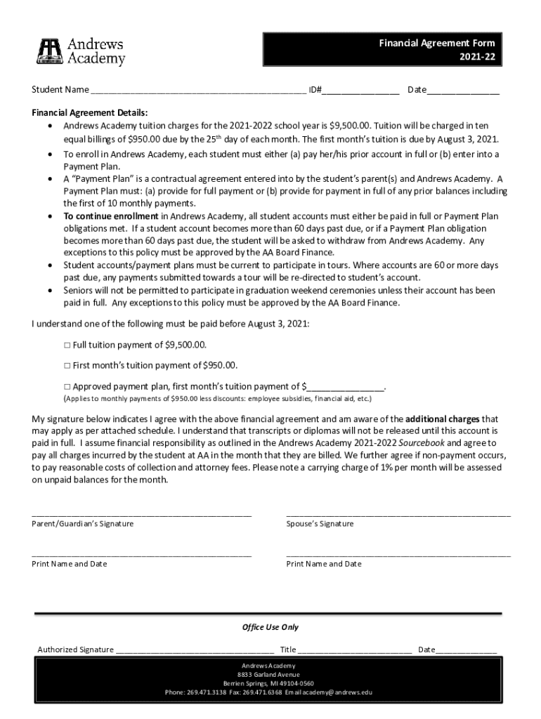 Financial Agreement Form 202122 Student Name ___ ID#___ Date___ Financial Agreement Details: Andrews Academy tuition charges for the 20212022 school year is $9,500.00. Tuition will be charged in ten