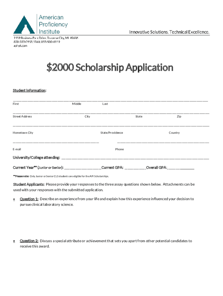 $2000 Scholarship Application Student Information: ___ FirstMiddleLast___ Street AddressCityStateZip___ Hometown Cityscape/Providence___ EmailCountry___ Preuniversity/College attending: ___ Current