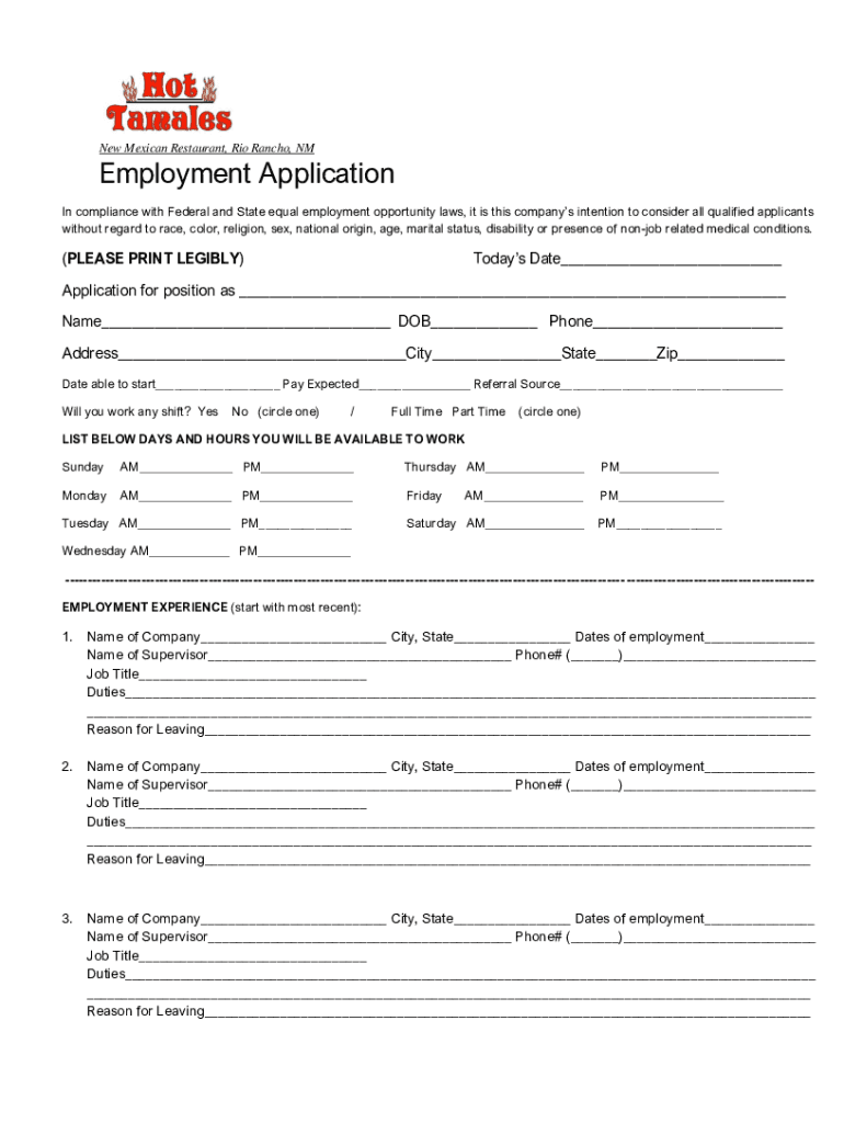 New Mexican Restaurant, Rio Rancho, Employment Application In compliance with Federal and State equal employment opportunity laws, it is this companies intention to consider all qualified applicants