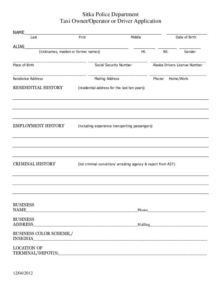 City and Borough of Site Police Department 304 Lake Street, Suite 102 Site, Alaska 99835 Robert Baby Chief of PolicePhone 7473245 Fax 7471075TAXI APPLICATION CHECKLIST You may submit your application