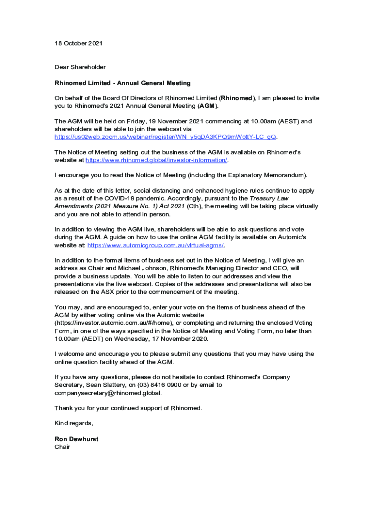 18 October 2021Dear Shareholder Rhino med Limited Annual General Meeting On behalf of the Board Of Directors of Rhino med Limited (Rhino med), I am pleased to invite you to Rhino med\'s 2021 Annual