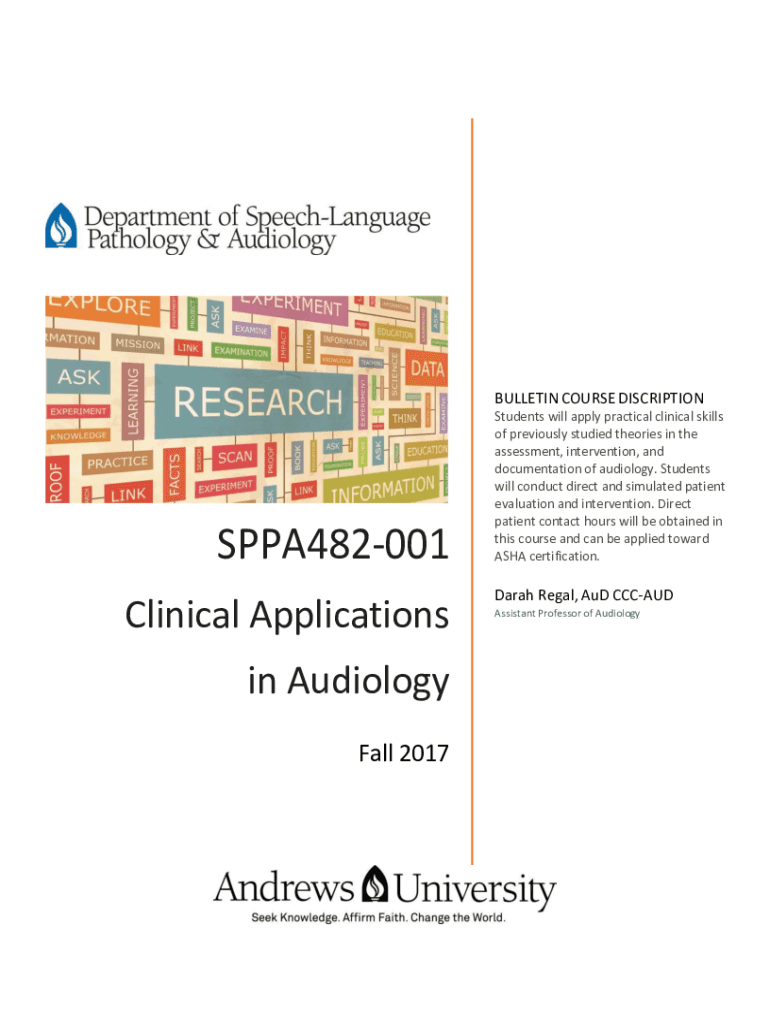 BULLETIN COURSE DISCRIPTIONSPPA482001 Clinical Applications in Audiology Fall 2017Students will apply practical clinical skills of previously studied theories in the assessment, intervention, and