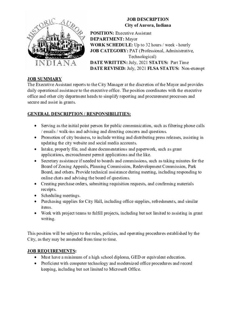 JOB DESCRIPTION City of Aurora, Indiana POSITION: Executive Assistant DEPARTMENT: Mayor WORK SCHEDULE: Up to 32 hours / week hourly JOB CATEGORY: PAT (Professional, Administrative, Technological)