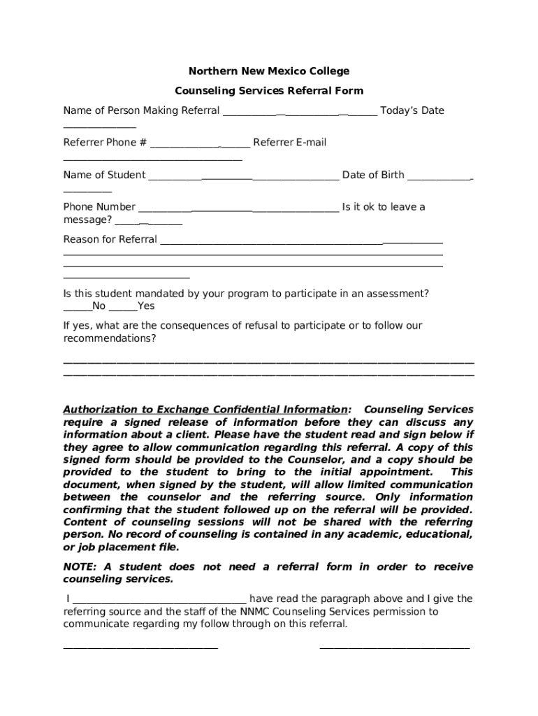 The New Mexico Medical Home Portal - General Counseling Services is a document that can be filled-out and signed for specific purpose. In that case, it is furnished to the relevant addressee to provide some details of any kinds. The completion and signing may be done manually in hard copy or with a suitable service e. g. PDFfiller. Such applications help to submit any PDF or Word file online. It also lets you edit it according to the needs you have and put a valid e-signature. Upon finishing, the user sends the New Mexico Medical Home Portal - General Counseling Services to the recipient or several recipients by mail or fax. PDFfiller offers a feature and options that make your Word template printable. It provides a variety of options for printing out. It does no matter how you deliver a form - in hard copy or electronically - it will always look professional and firm. In order not to create a new document from the beginning again and again, turn the original form as a template. After that, you will have an editable sample.