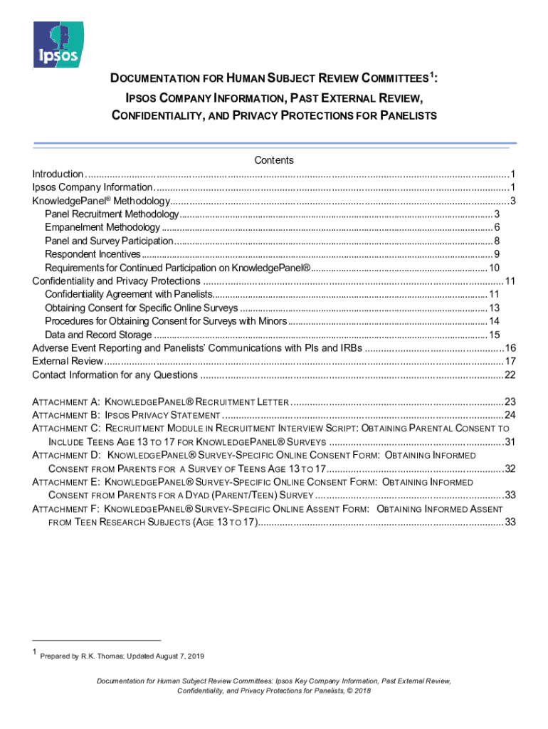 DOCUMENTATION FOR HUMAN SUBJECT REVIEW COMMITTEES 1: DIPSOS COMPANY INFORMATION, PAST EXTERNAL REVIEW, CONFIDENTIALITY, AND PRIVACY PROTECTIONS FOR PANELISTS Contents Introduction ...........................................................................................................................................................1