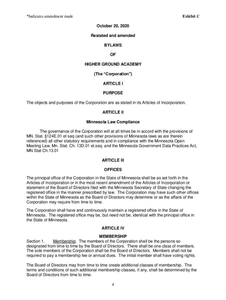 *Indicates amendment madeExhibit C October 20, 2020, Restated and amended BYLAWS OF HIGHER GROUND ACADEMY (The Corporation) ARTICLE I Purpose objects and purposes of the Corporation are as stated