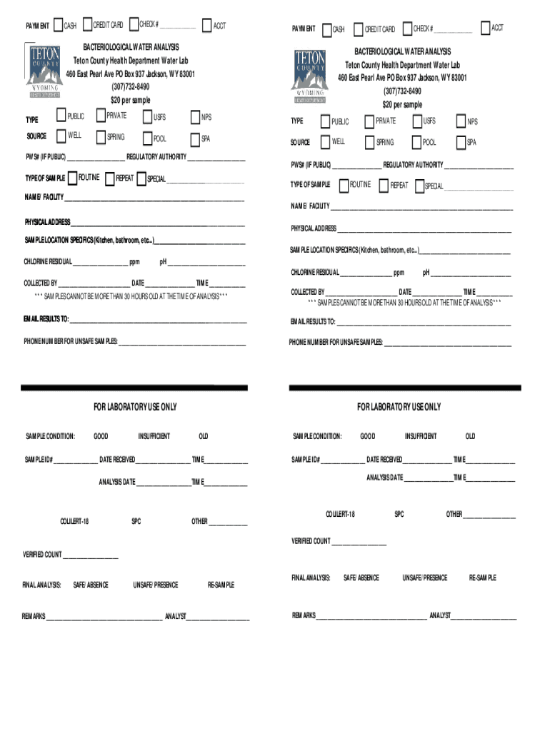 PAYMENTCHECK # ___CREDIT CARDCASHACCTPAYMENTBACTERIOLOGICAL WATER ANALYSIS Eton County Health Department Water Lab 460 East Pearl Ave PO Box 937 Jackson, WY 83001 (307)7328490 ×20 per sampleCHECK