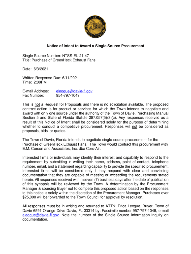 Notice of Intent to Award a Single Source Procurement Single Source Number: NTSSEL2147 Title: Purchase of Greenback Exhaust Fans Date: 6/3/2021 Written Response Due: 6/11/2021 Time: 2:00PM Email Address: