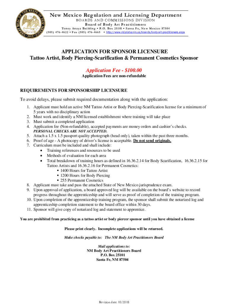 New Mexico Regulation and Licensing Department BO AR DS A ND CO M MI SSI ON S D I V IS IO N B oar d o f Body Ar t Pr ac ti on her St on a By i LD in g P. O. Box 251 01 S a NT an F e, New Mexico 87504